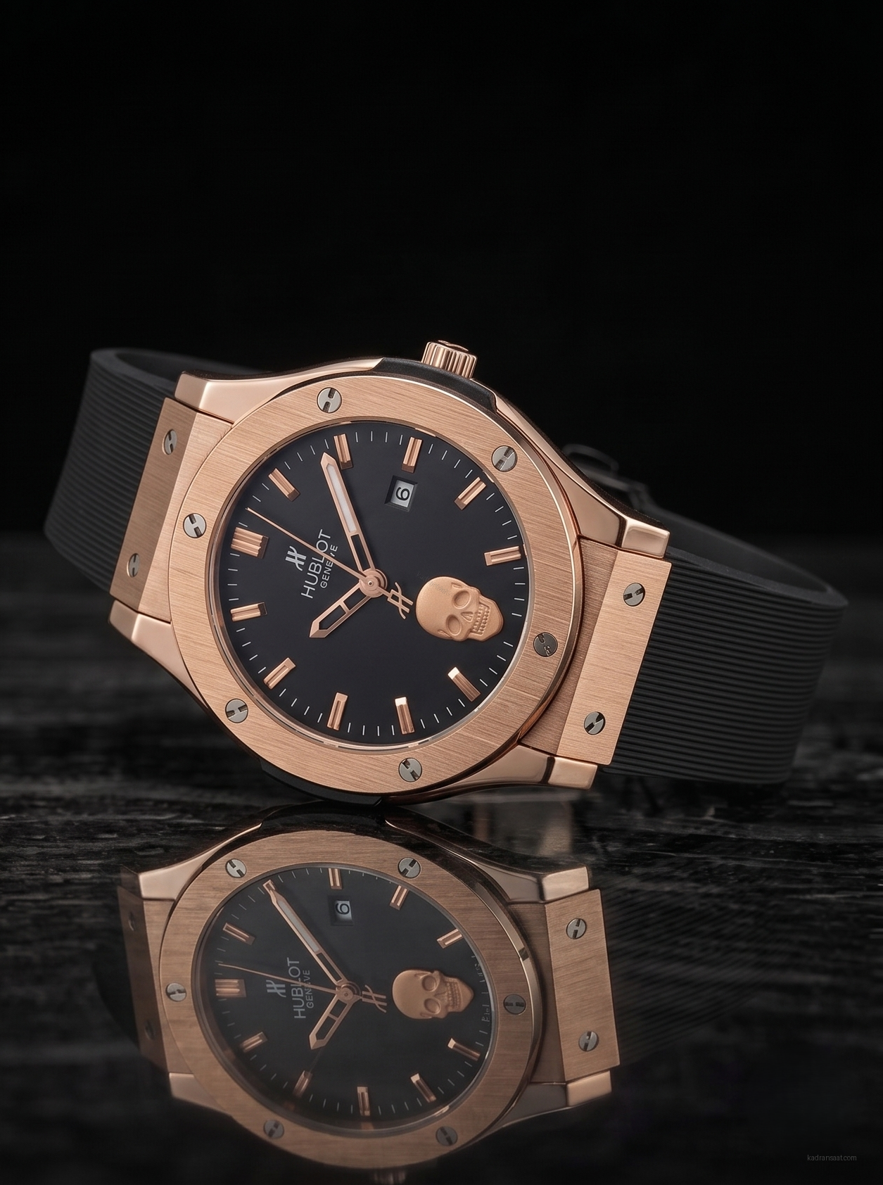 Büyük Kasa Rose Gold Kasa Kurukafa Detaylı Siyah Saat