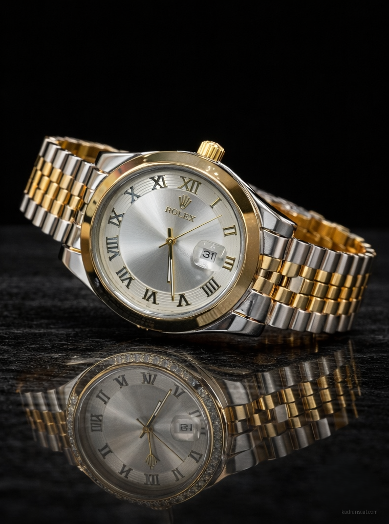 Altın ve gümüş tonlarının eşsiz uyumunu yansıtan bu özel model, klasik saat tasarımının en seçkin örneklerinden biridir. Gümüş rengi güneş ışını kadranı ve asil Roma rakamlarıyla zenginleştirilen tasarımı, her türlü kıyafetle kusursuz bir uyum yakalar. Hem günlük hayatta hem de özel günlerde şıklığınızı tamamlayacak, bileğinizde ağırlığını hissettiren prestijli bir seçimdir.