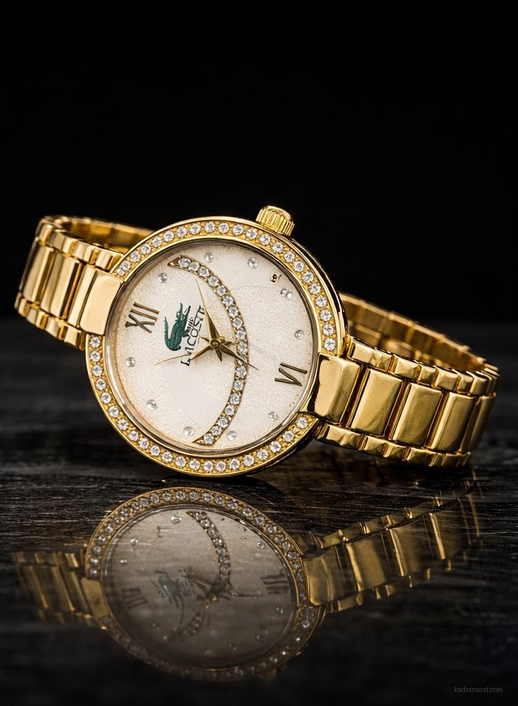 Altın rengin göz alıcı ihtişamını zarafetle buluşturan bu özel tasarım, şıklığınızı bir üst seviyeye taşıyor. Çerçevesini ve kadranını süsleyen ışıltılı kristal taşlar, her hareketinizde zarif bir parlaklık sunarak dikkatleri üzerinize çekiyor. Gündüzden geceye uzanan her kombininize lüks ve feminen bir hava katacak kusursuz bir aksesuar.
